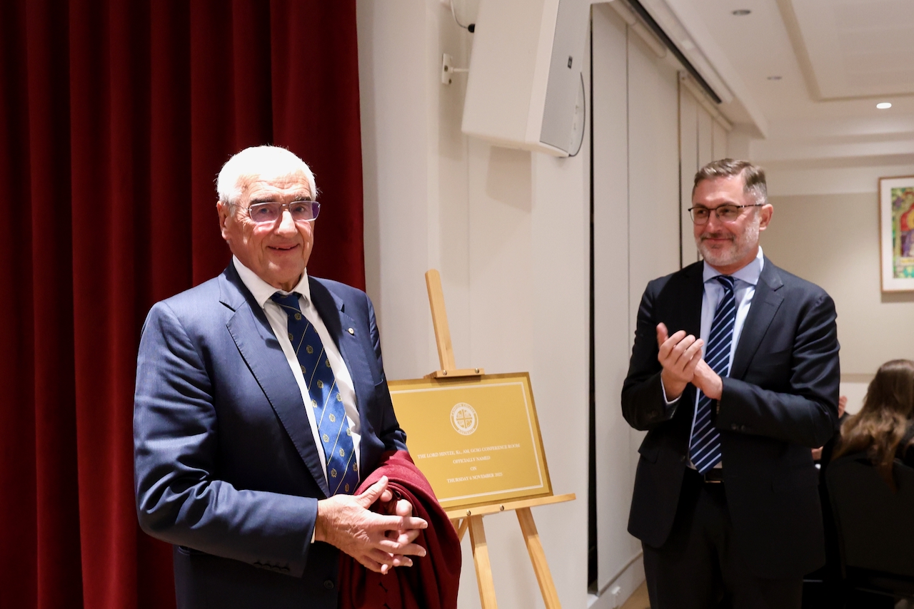 The evening also marked a special occasion for the College community with the unveiling of the Lord Hintze Conference Room. The room was named in recognition of Lord Hintze’s longstanding contributions to education, philanthropy and public life. College President Dr Paul Morrissey led the dedication following the guest address, thanking Lord Hintze for his example of faith and service and his generous support of educational and charitable initiatives around the world.